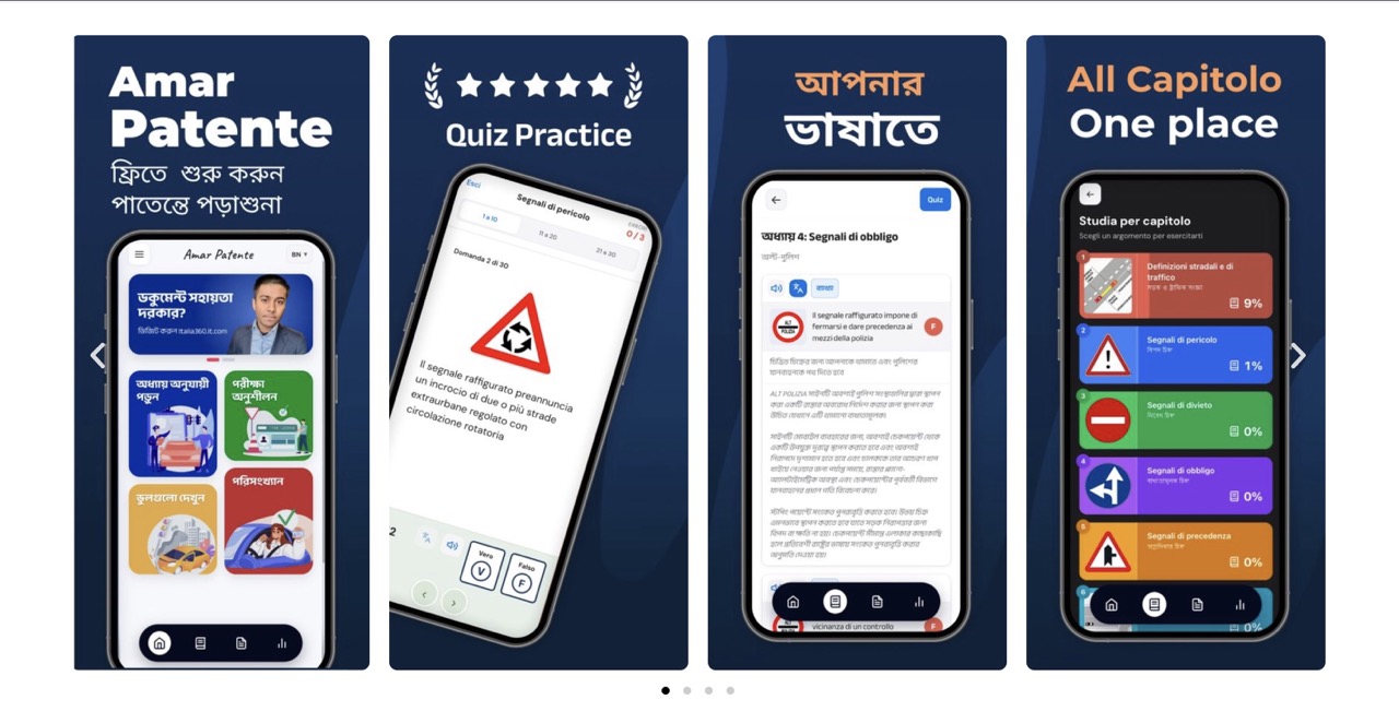 Amar Patente helps you prepare for the Italian driving theory exam (patente B) with practice questions, chapter-by-chapter study, and a full exam simulation.